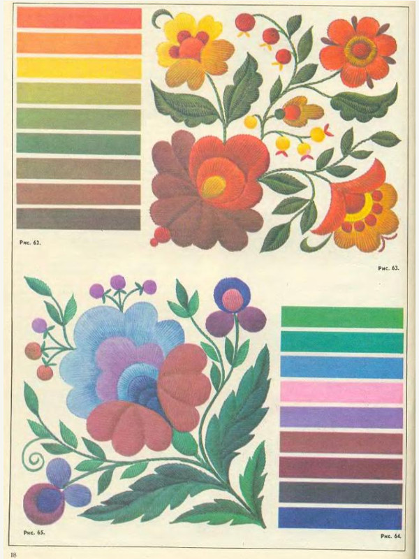 Сочетание цветов в вышивке узоров двусторонней гладью.