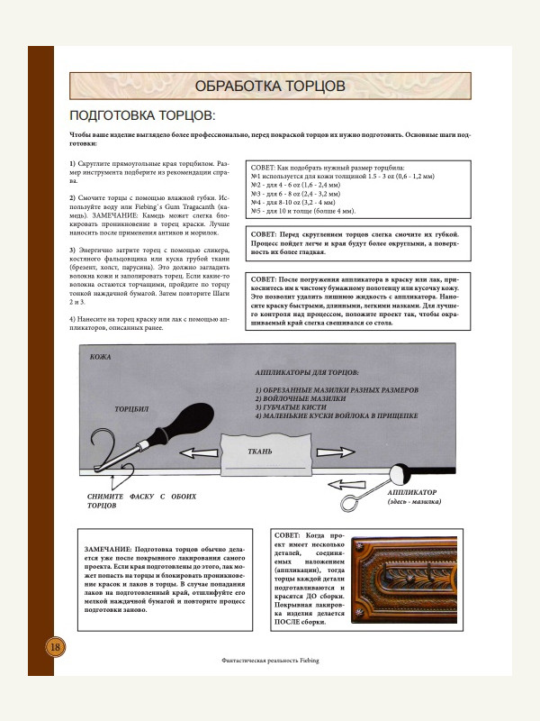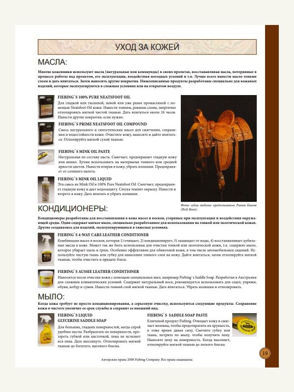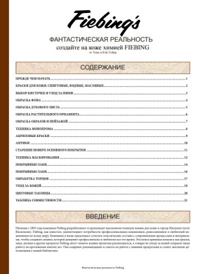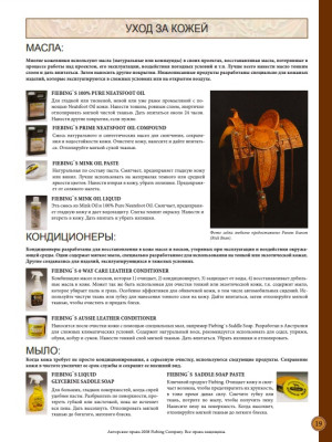 Для всех интересующихся химией (здесь конкретно рассматривается химия компании Fiebing's): описание всех средств, порядок нанесения, различные сочетания, уход за кожей, обработка торцов, соответствие английских и русских названий, и многое другое описано в книге-инструкции на русском языке Fantastic Finish Russian.