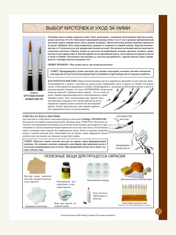 Для всех интересующихся химией (здесь конкретно рассматривается химия компании Fiebing's): описание всех средств, порядок нанесения, различные сочетания, уход за кожей, обработка торцов, соответствие английских и русских названий, и многое другое описано в книге-инструкции на русском языке