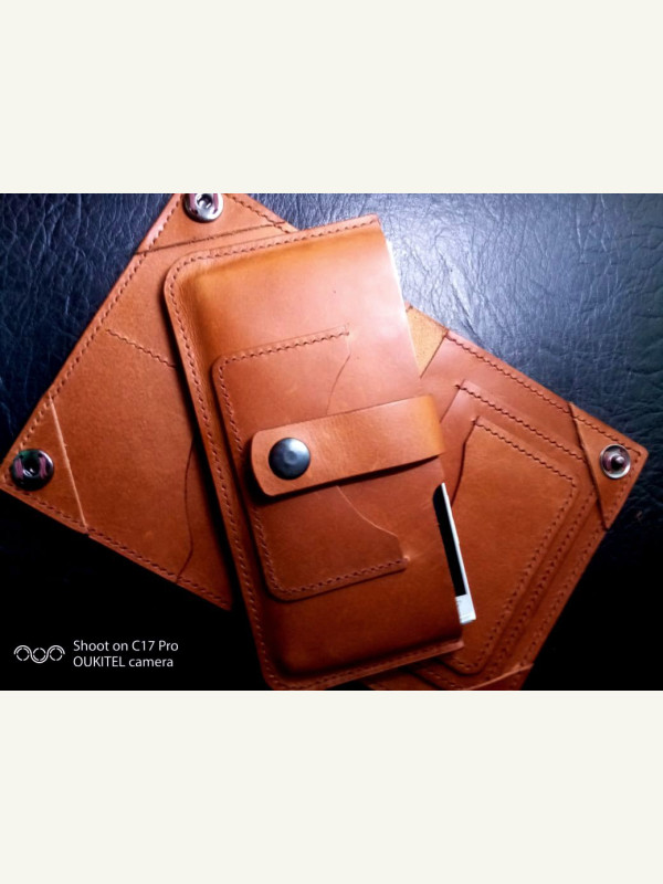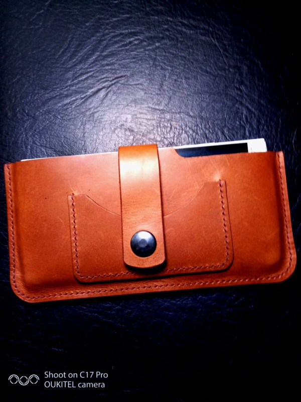 Вот такие докхолдер и чехол для смартфона получились у меня. Кожа растительного дубления с финишем Коньяк 1,2 мм№ 66, нитки №8 Zj шаг 3.38 края токонол + коламбус. Выкройки под шаг 3,38.