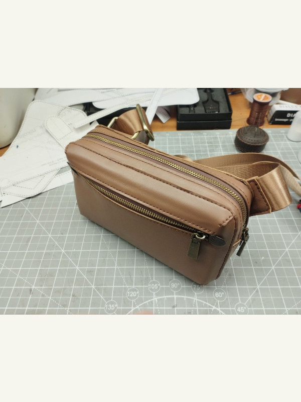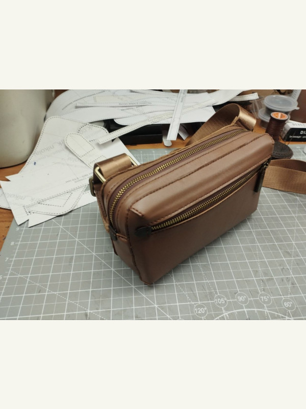 Рекомендованная кожа основных деталей — средней плотности 1.6-1.8 мм (я использовал мягкую кожу 1.1-1.4 мм и разные уплотнители, поэтому передняя стенка изогнулась чуть по другому от фото исходника)Для подкладка тонкую 0.6 мм или ткань по выборуМолнии #5 — длина обозначенаСтропа и полукольца — 38-40 ммДлина стропы от 1.5 м.