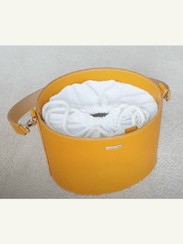 Женская овальная сумка-ведро с тканевым чехлом на кулиске.