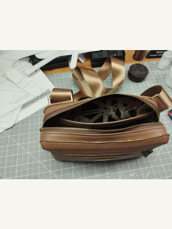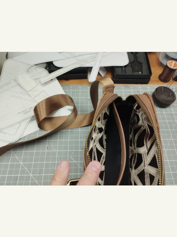 Рекомендованная кожа основных деталей — средней плотности 1.6-1.8 мм (я использовал мягкую кожу 1.1-1.4 мм и разные уплотнители, поэтому передняя стенка изогнулась чуть по другому от фото исходника)Для подкладка тонкую 0.6 мм или ткань по выборуМолнии #5 — длина обозначенаСтропа и полукольца — 38-40 ммДлина стропы от 1.5 м.