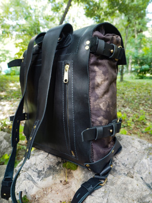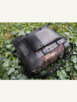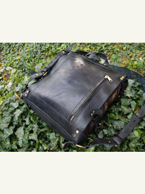 Натуральная кожа 2,2-2,5 мм, ткань Оксфорд 600D + дублерин. Кевларовая нить 0,6 мм и латунная фурнитура. Размер 34х28х18 см.